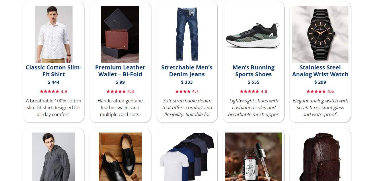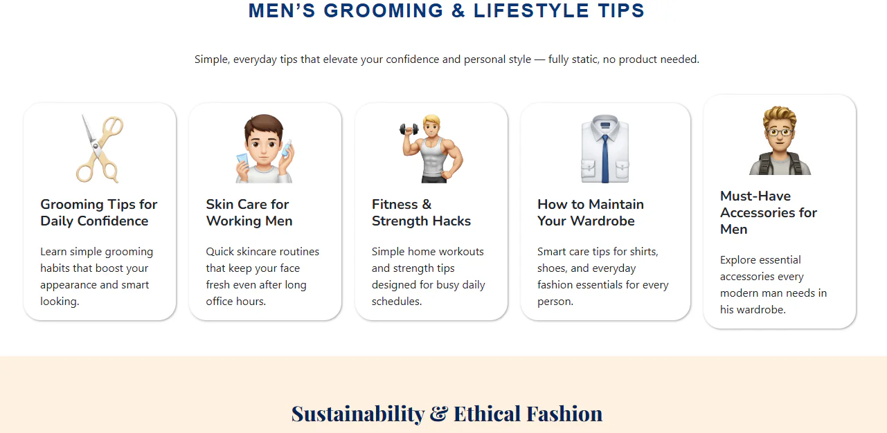 👔 Men’s Fashion-Focused Design -Professionally designed layouts tailored for men’s clothing, apparel, accessories, footwear, and lifestyle fashion stores, delivering a bold and modern brand presence.